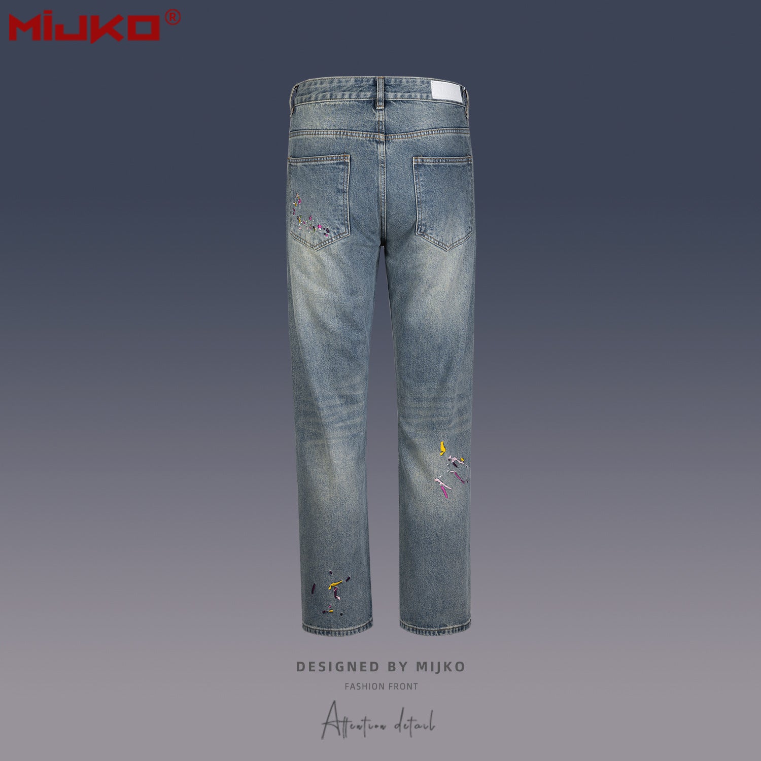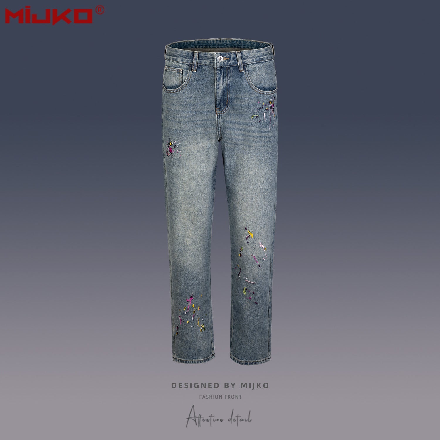 MIJKO Mens Vintage Pants Embroidery Embellished Slim-fitting Old Jeans