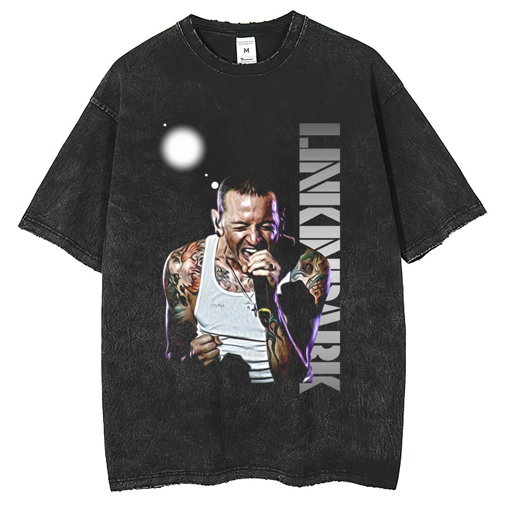 Mens T Shirts American print vintage print fried flower short sleeve T-shirt